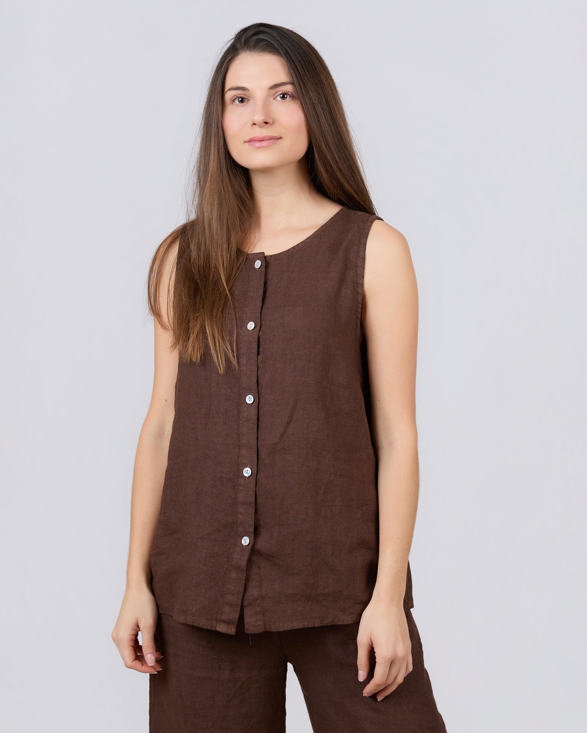 Sleeveless blouse in 100% linen with buttons, crafted in a chocolate tone for maximum versatility. The front buttons allow for a customized fit and add a structured detail to the garment. The natural fabric provides exceptional breathability, ideal for layering or wearing on its own in warmer weather. Its clean, minimalist cut adapts to a variety of settings, from casual outfits to more sophisticated looks. An essential piece that prioritizes functionality without sacrificing sophistication.