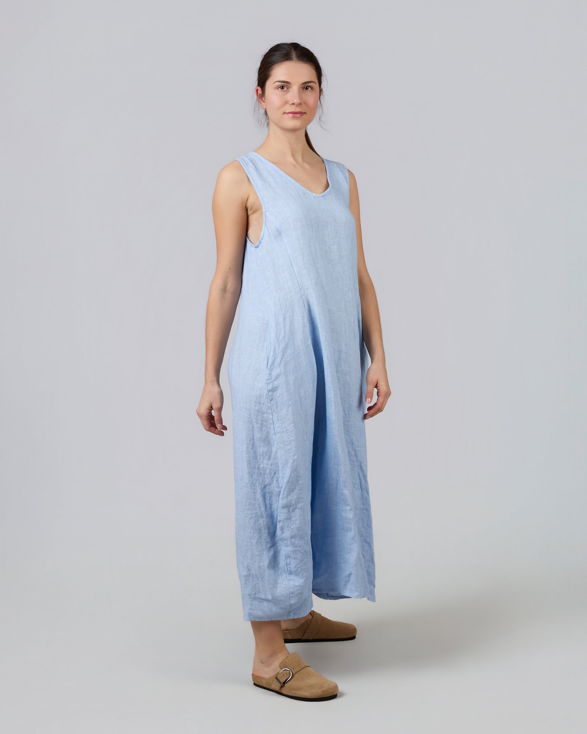 This sleeveless dress, crafted from 100% linen, features a bow detail and is designed in a dawn shade for contemporary elegance. The bow adds a touch of femininity and character, while the sleeveless design maximizes breathability in warmer weather. The natural fabric offers a fluid drape that flatters the figure without restriction. Its versatility allows it to be worn as a centerpiece in minimalist looks or layered in more complex compositions, making it an essential staple for conscious and versatile wardrobes.